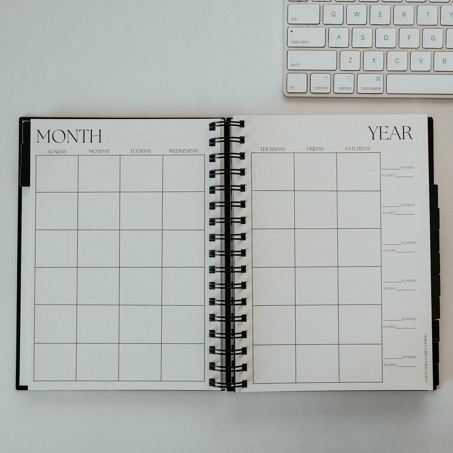This planner is dateless and fully customizable! With unique features like a monthly editing and project log, weekly time slots for sunrise and sunset, income, expense and milage trackers, yearly income projection, an editing calculator, goal setting and reflection prompts and more.